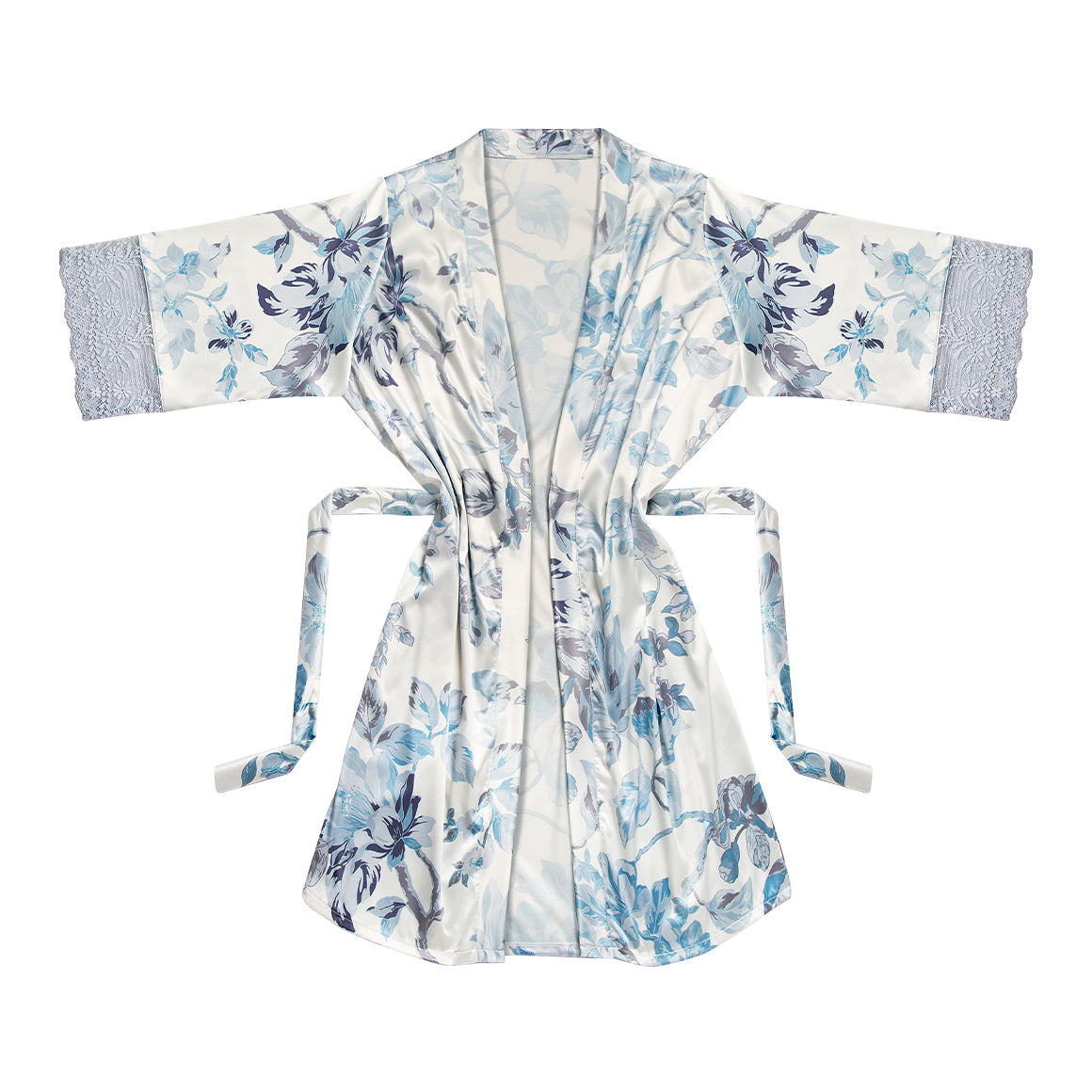 Bata con mangas sueltas con dos cordones en cintura (uno interno y el otro externo) para ajustarse. elaborado con tela de satín y encaje en ruedo de mangas.