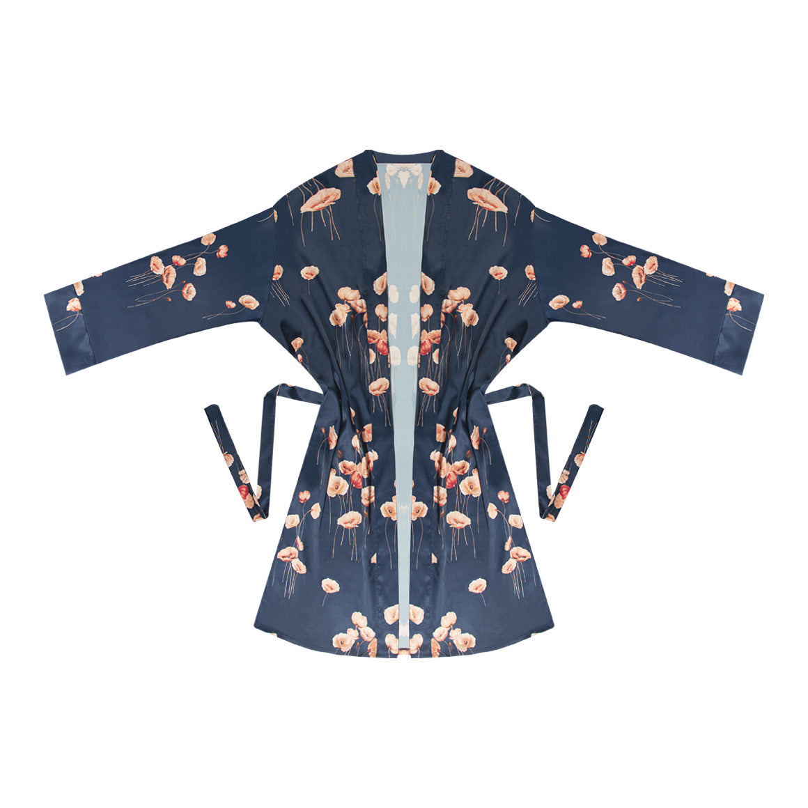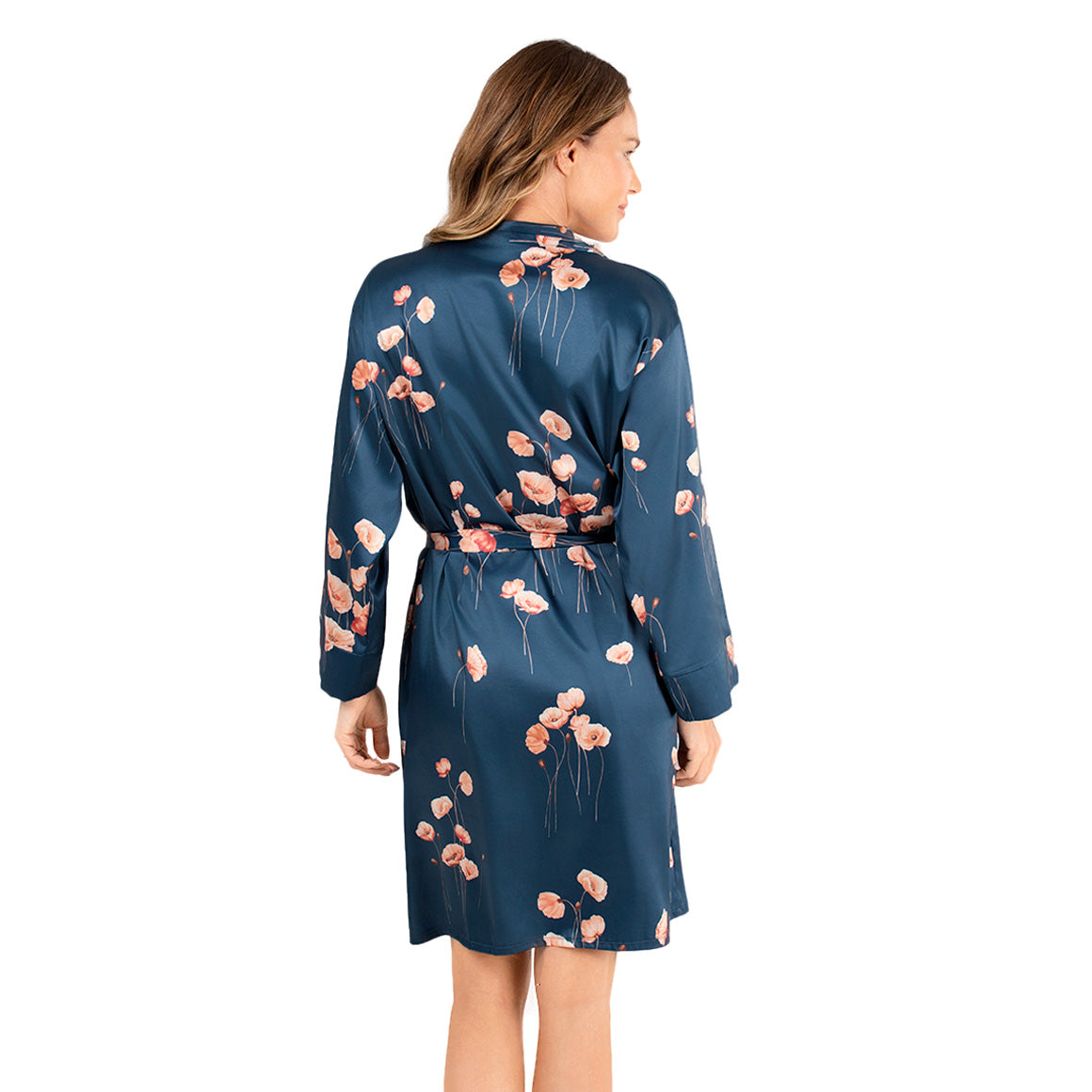 Bata con mangas sueltas con dos cordones en cintura (uno interno y el otro externo) para ajustarse. elaborado con tela de satín.