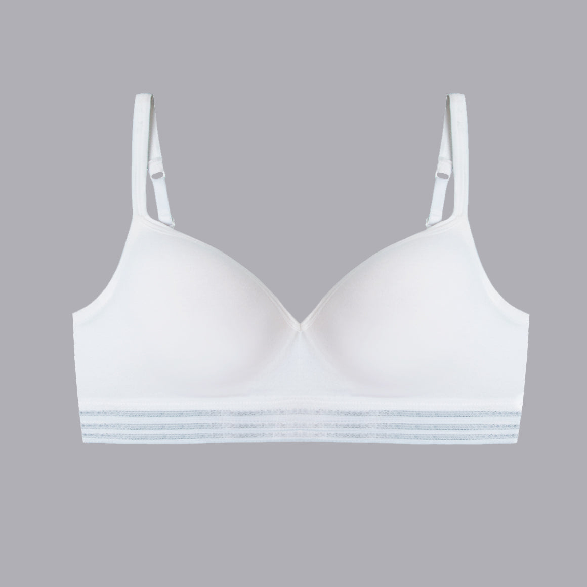 Brasier sin aros y copas juveniles prehormadas con realce (push up). banda angosta con elástico decorado en la orilla inferior para un mejor soporte. broche de dos ganchos y tres niveles de ajuste. tirantes regulables. elaborado de algodón elastano.