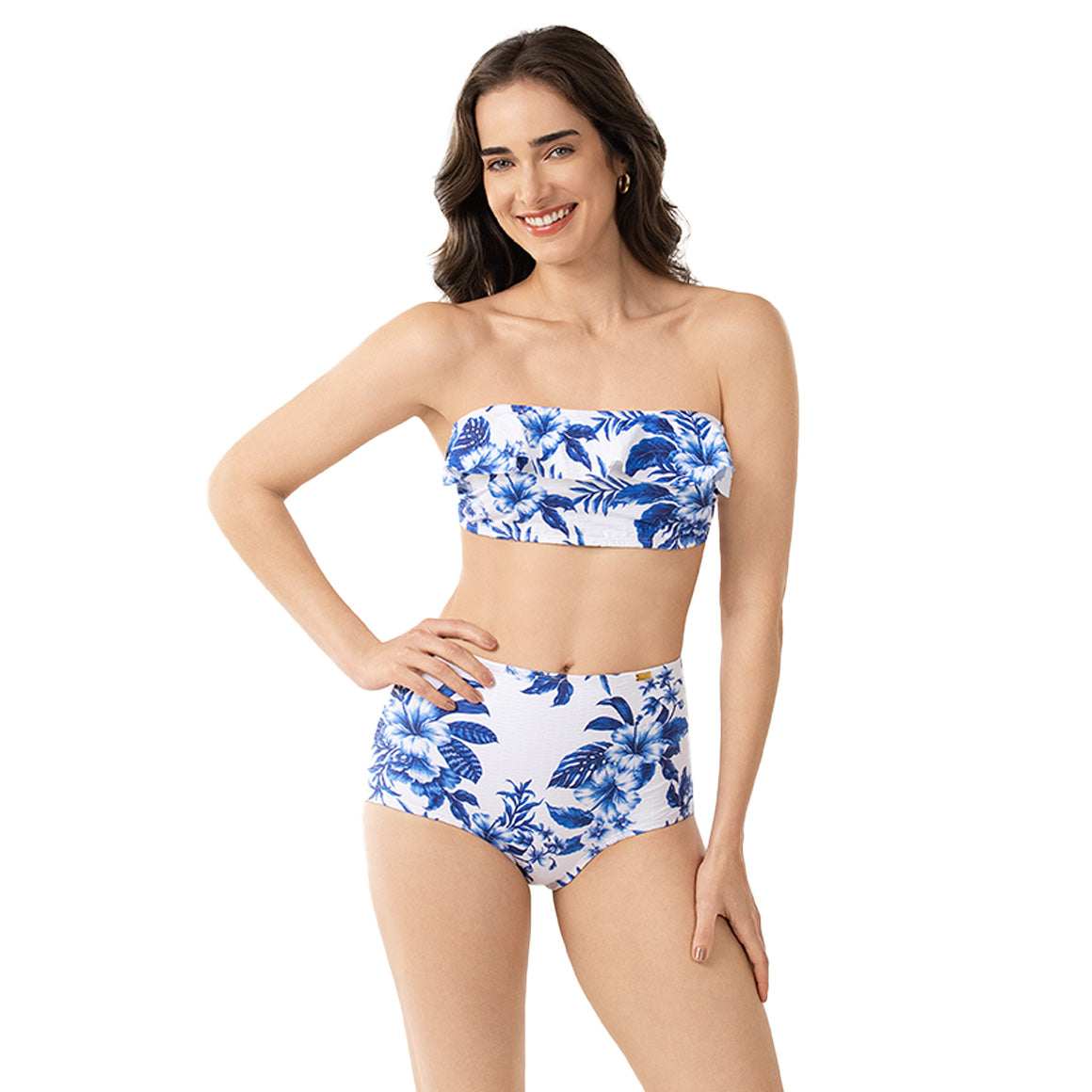 Traje de baño de dos piezas. elaborado de microfibra con textura, incluye elástico en los contornos para un mejor ajuste y forro de poliéster que aporta suavidad. top tipo bandeau con copas prehormadas sin realce, removibles y varillas laterales que proporcionan mayor soporte al busto. su diseño con tirantes tipo halter y removibles te permite ajustar el estilo a tu gusto. un volado decorativo en la parte superior añade un toque femenino y delicado, mientras que el detalle metálico central (removible) te permite llevarlo en dos versiones: més elegante o més relajada. panty con talle alto cobertura tipo cachetero ideal para estilizar la silueta sin sacrificar comodidad.