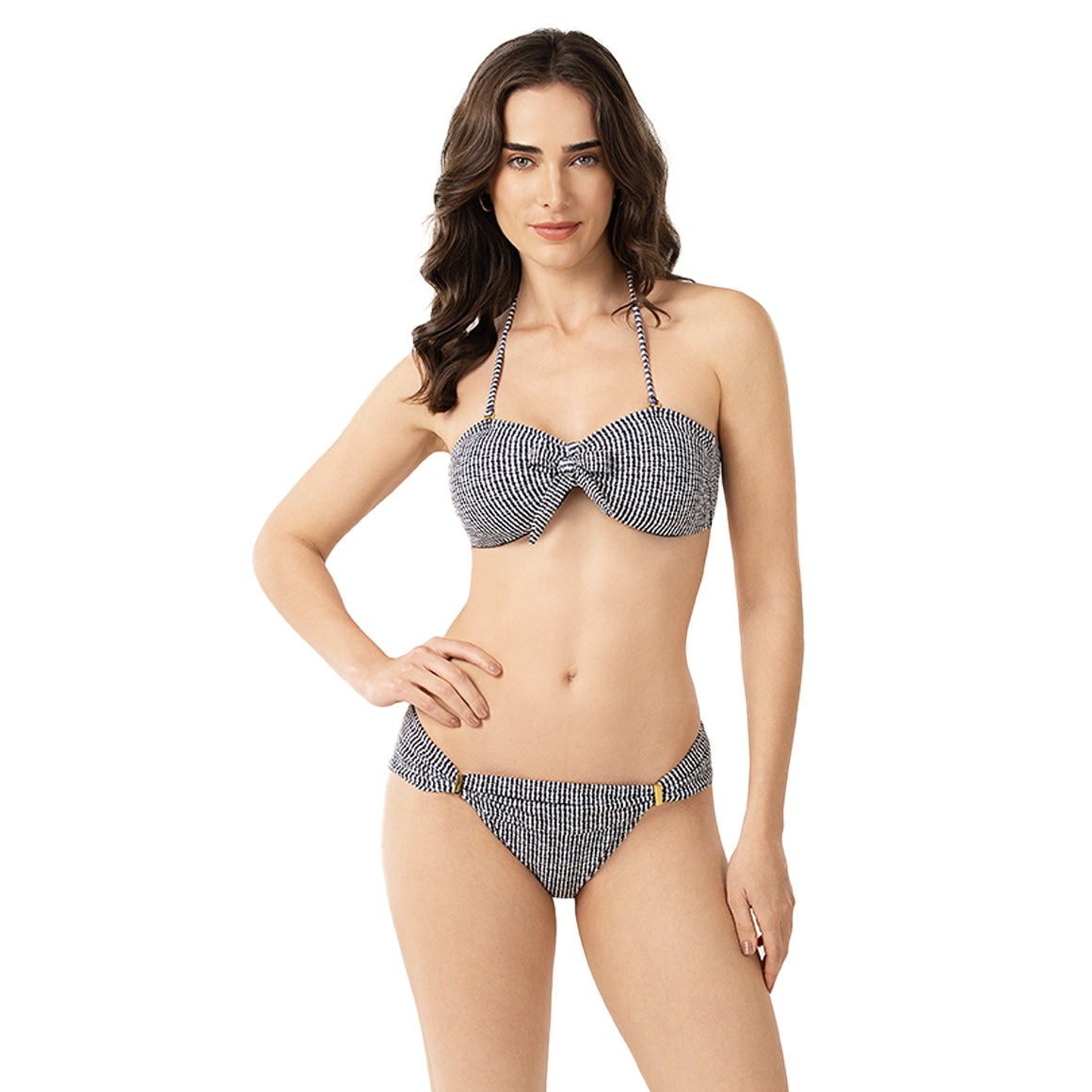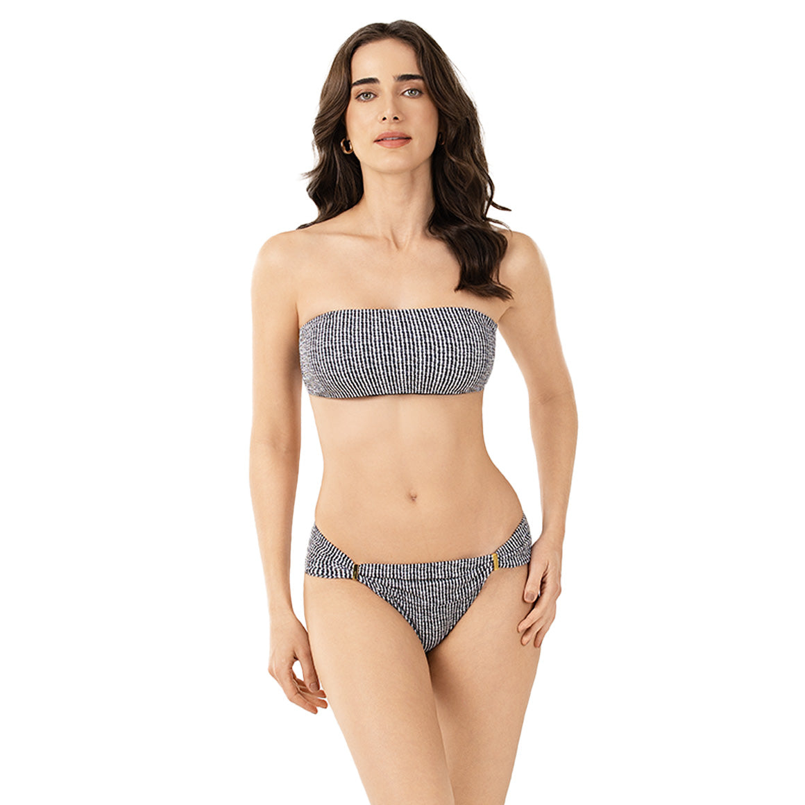 Traje de baño de dos piezas, elaborado de microfibra con textura incluye elástico en los contornos para un mejor ajuste y forro de poliéster que aporta suavidad. top tipo bandeau combina copas prehormadas sin realce, removibles y varillas laterales que proporcionan soporte y realce natural. su diseño con tirantes tipo halter y removibles te permite ajustar el estilo a tu gusto, con una tira central de tela (removible) te permite llevarlo en dos versiones, mientras que el cierre de hebilla con cuatro niveles de ajuste asegura confort. panty con talle bajo y cobertura media incorpora detalles metálicos en los costados frontales, aportando un toque moderno que realza la silueta. este traje de baño combina diseño y funcionalidad es una prenda que resalta tu figura con distinción.