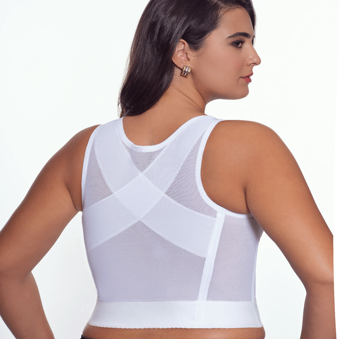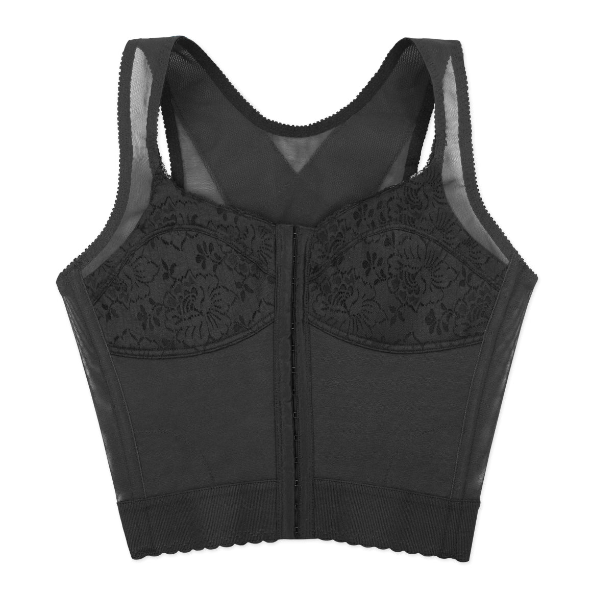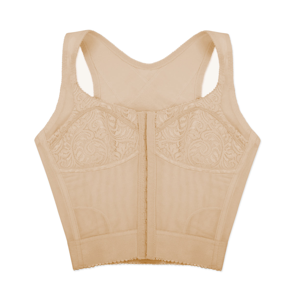 Bustier sin aros, copas sin realce con refuerzo. varillas frontales y posteriores, de banda hasta la cintura con elástico para un mejor ajuste. broche frontal de 14 (catorce) ganchos y dos niveles de ajuste, con tirantes anchos. elaborado de powernet, y copas de encaje. ideal para corregir la postura, por su soporte y refuerzo en la espalda en x.