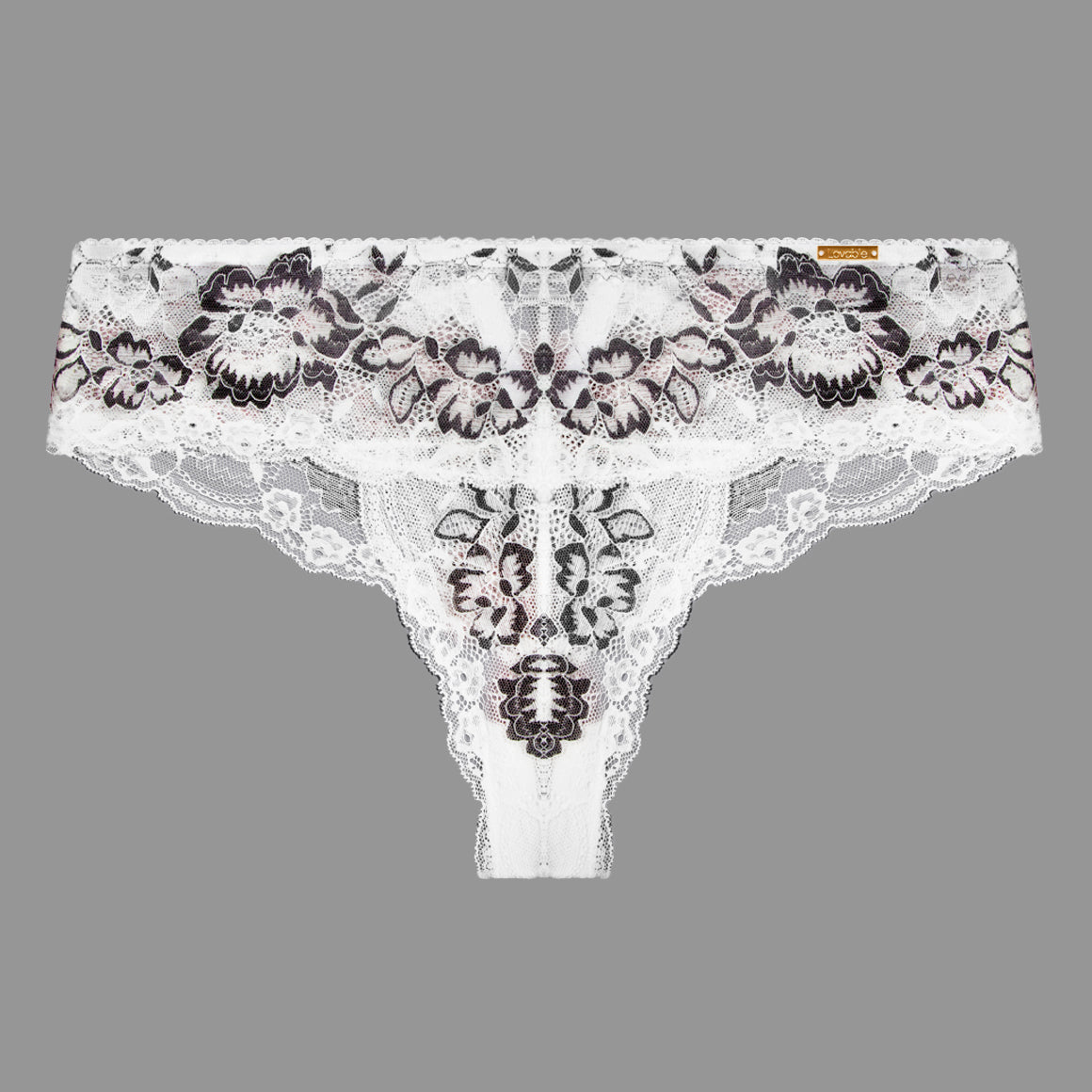 Tanga con talle medio. elaborado de encaje y elástico decorado en cintura con pequeña abertura en la parte posterior. puente inferior de algodón.