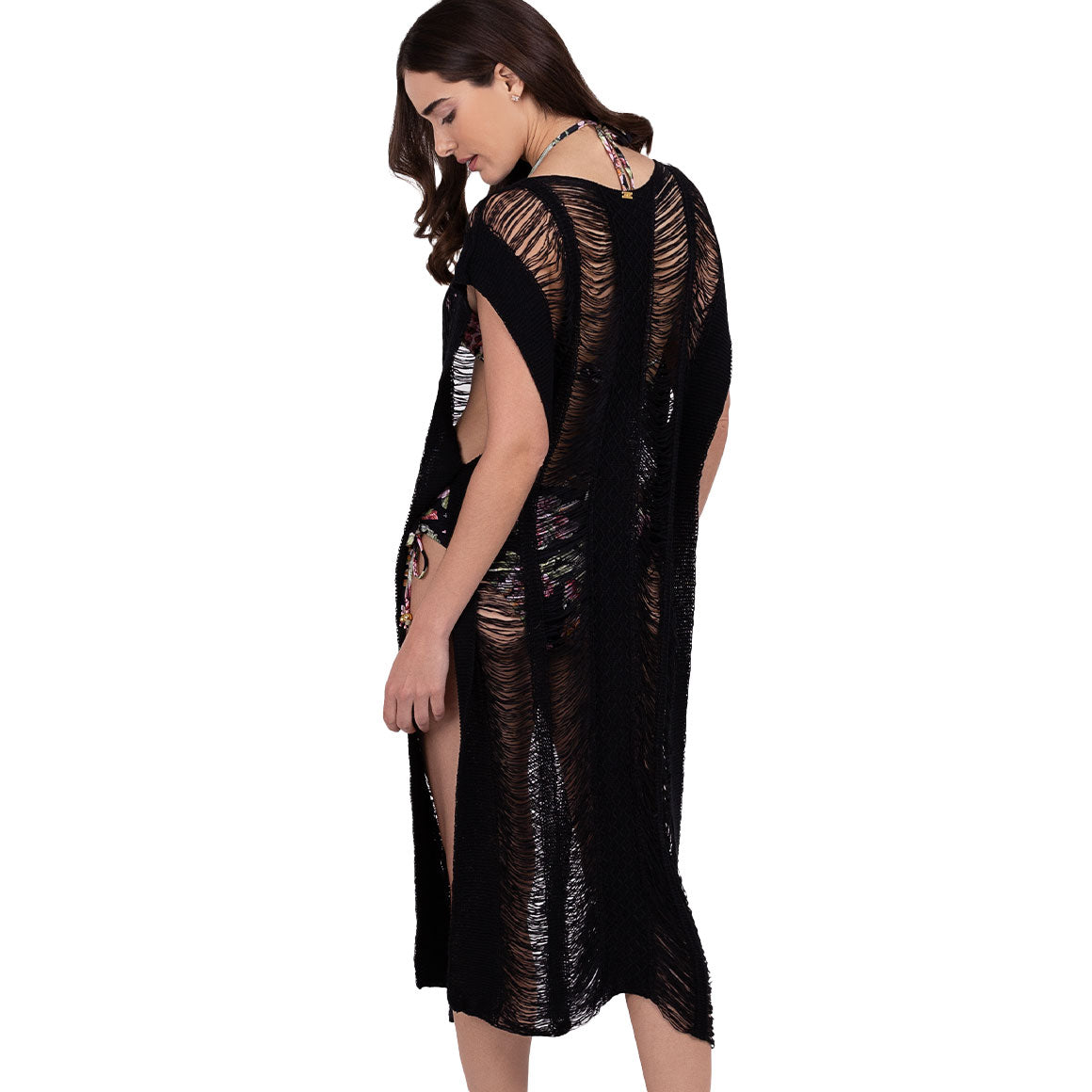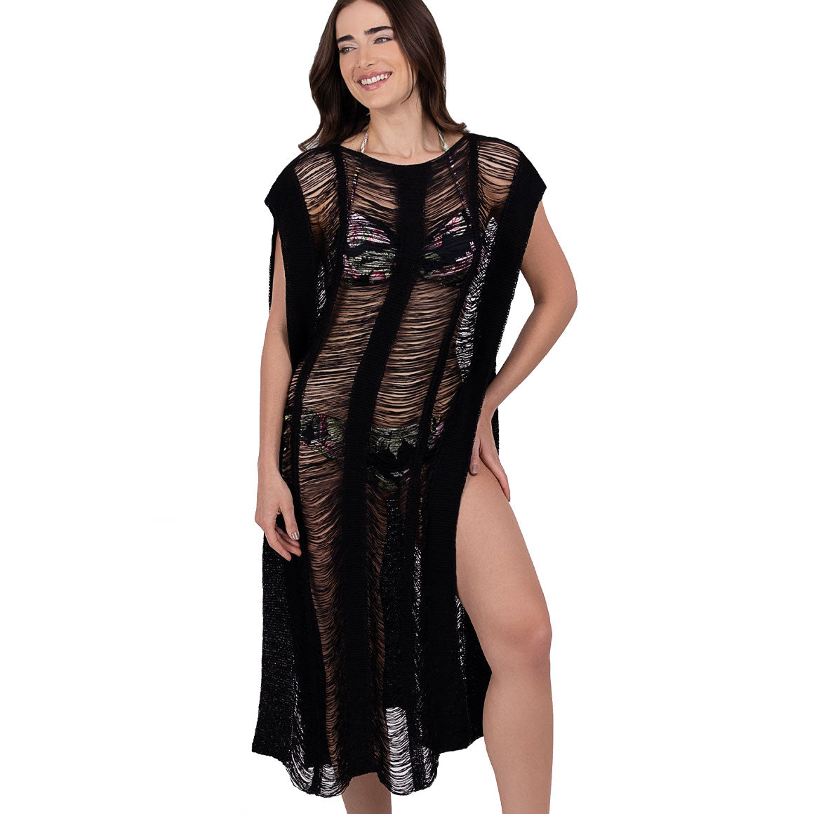 Salida de baño tipo tínica larga y suelta. con cuello redondo y cuenta con finas tiras holgadas. elaborado de crochet.