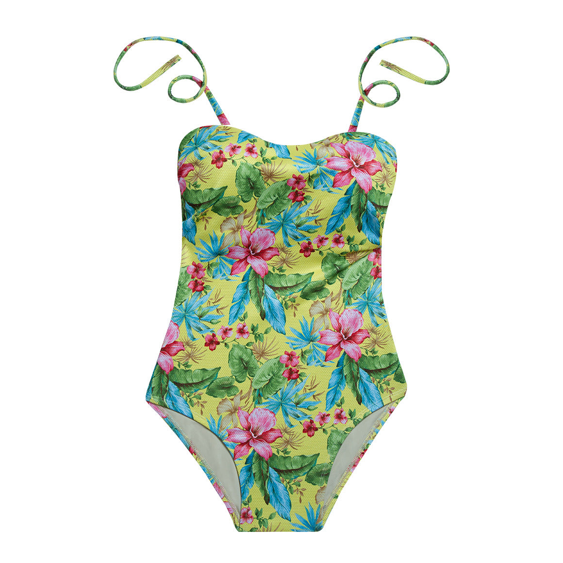 Traje de baño entero, copas prehormadas, sin realce y varillas laterales. tirantes tipo halter y removibles. banda separada en la espalda con cierre de amarre y escote posterior en u. cobertura media de la parte posterior del panty y escote de pierna alta. elaborado de microfibra con textura, elástico en los contornos para un mejor ajuste y forro de poliéster.