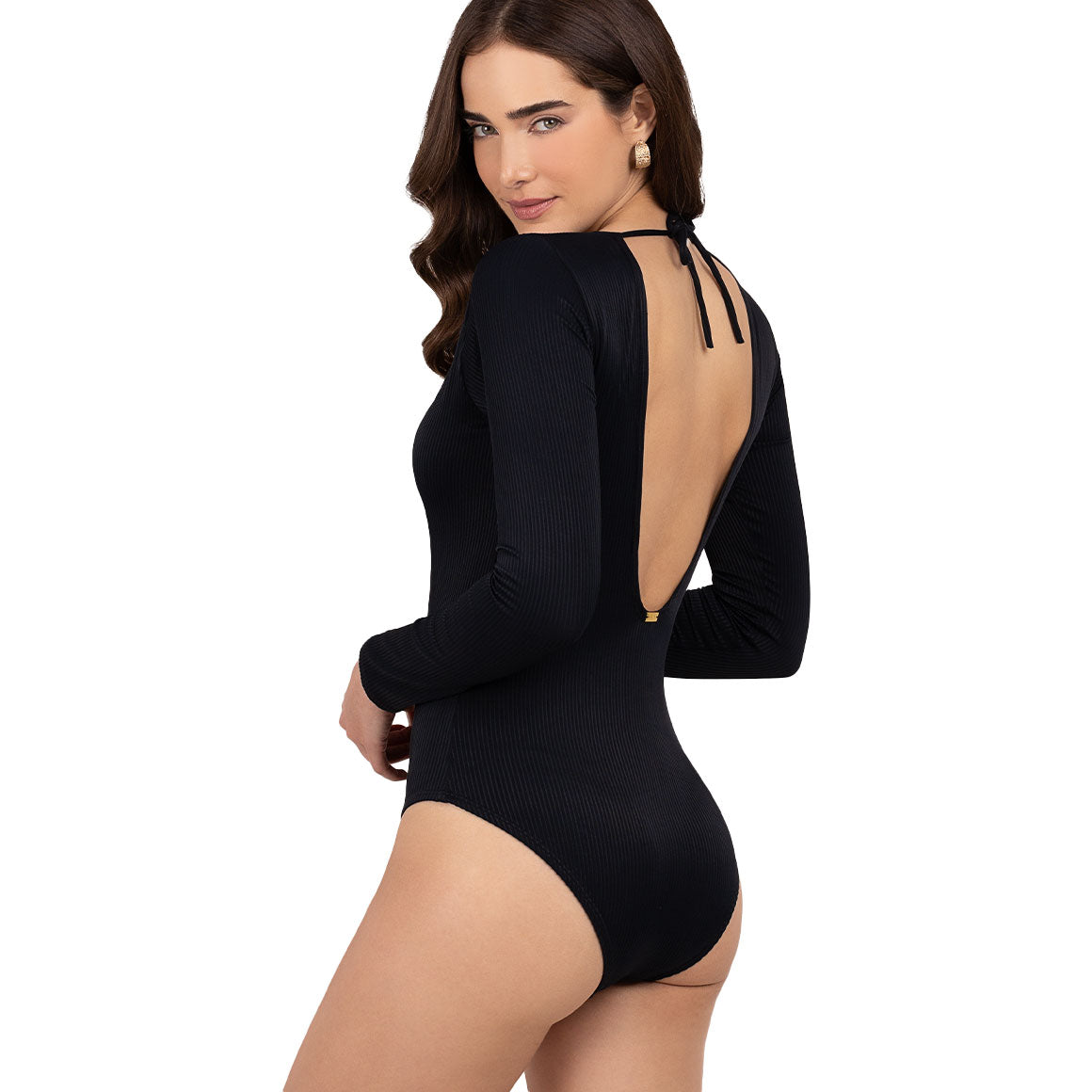 Traje de baño entero de manga larga, escote profundo que va desde la parte frontal hasta la espalda con cordón de amarre en la parte superior, copas prehormadas y removibles. cobertura media de la parte posterior del panty y escote de pierna alta. elaborado de microfibra con textura, elástico en los contornos para un mejor ajuste y forro de poliéster.