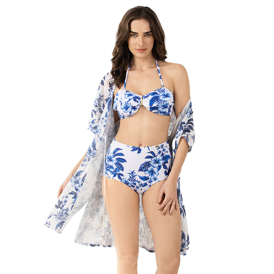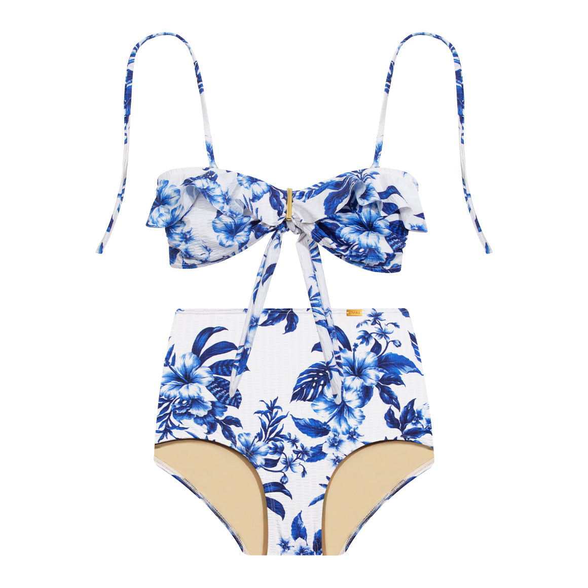 Traje de baño de dos piezas. elaborado de microfibra con textura, incluye elástico en los contornos para un mejor ajuste y forro de poliéster que aporta suavidad. top tipo bandeau con copas prehormadas sin realce, removibles y varillas laterales que proporcionan mayor soporte al busto. su diseño con tirantes tipo halter y removibles te permite ajustar el estilo a tu gusto. un volado decorativo en la parte superior añade un toque femenino y delicado, mientras que el detalle metálico central (removible) te permite llevarlo en dos versiones: més elegante o més relajada. panty con talle alto cobertura tipo cachetero ideal para estilizar la silueta sin sacrificar comodidad.