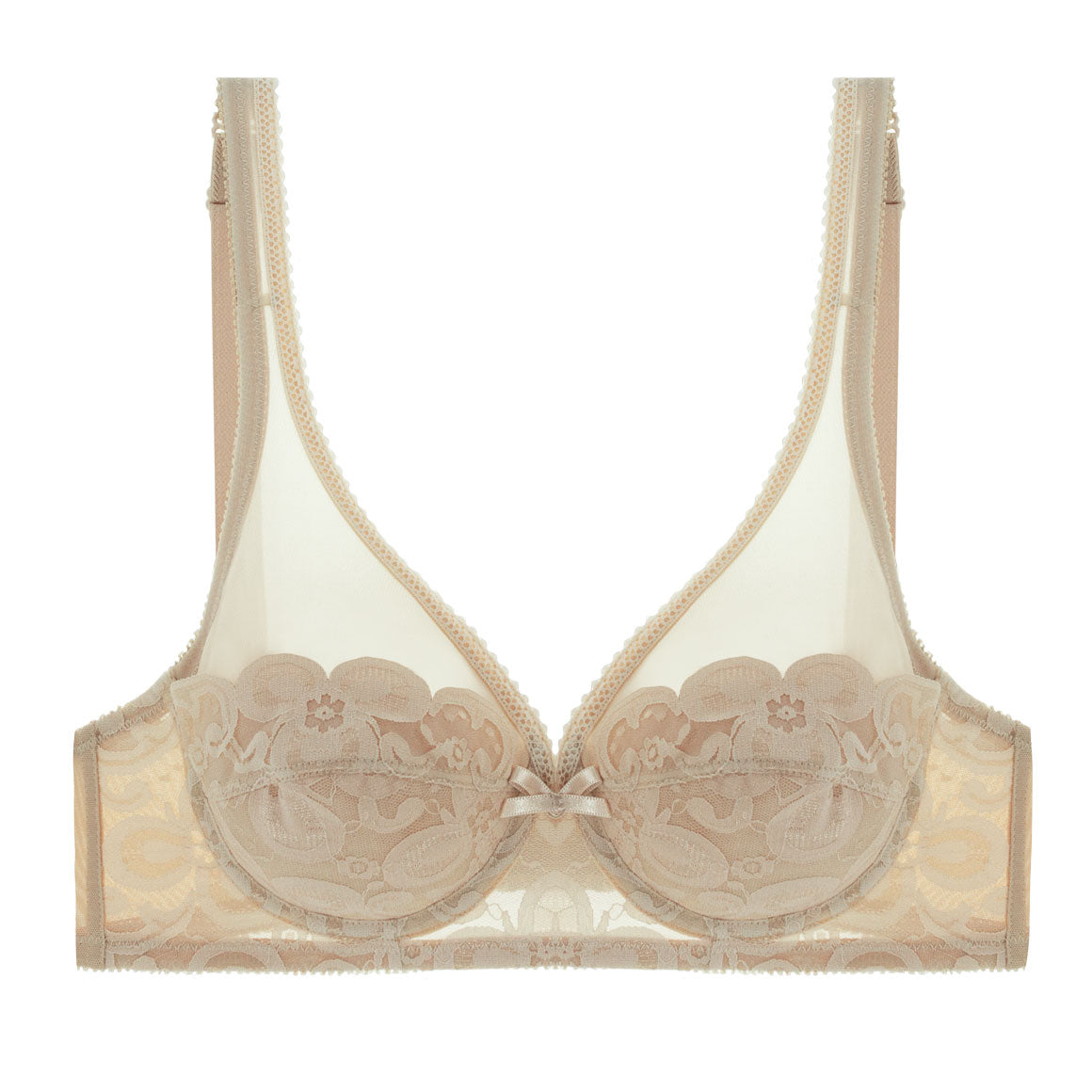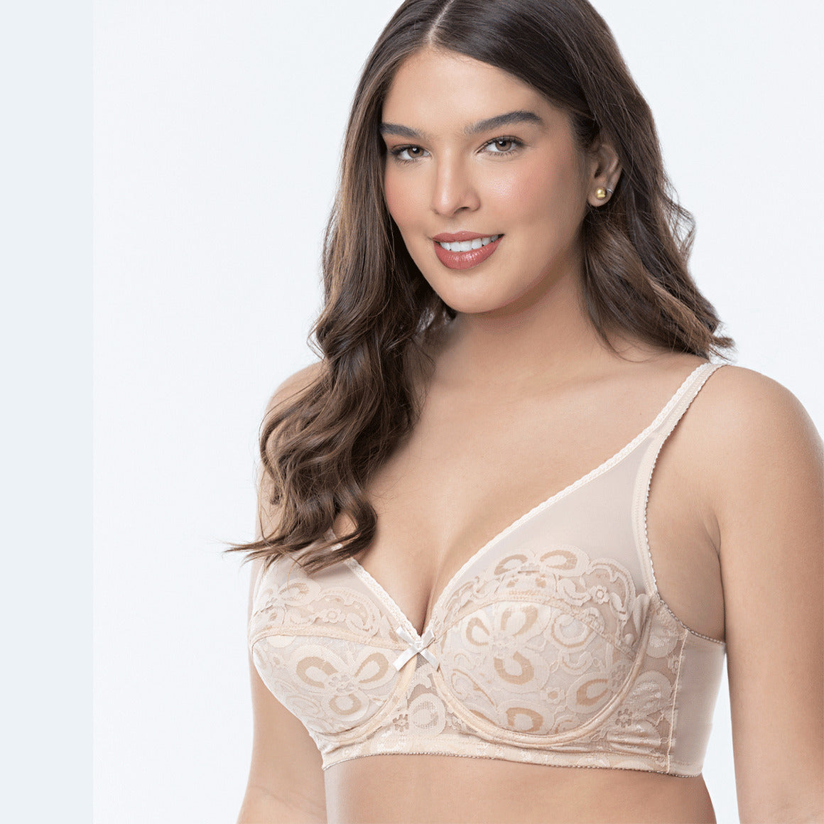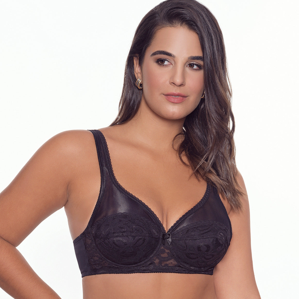 Brasier con aros, copas sin realce reforzadas con doble tela. banda media con elástico para un mejor ajuste, broche de dos ganchos y tres niveles de ajuste, con tirantes anchos regulables. elaborado de powernet en la banda posterior, encaje en la parte frontal y en copas.