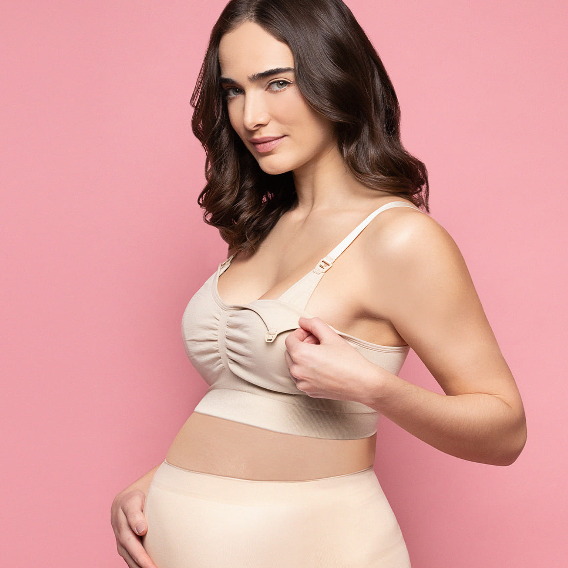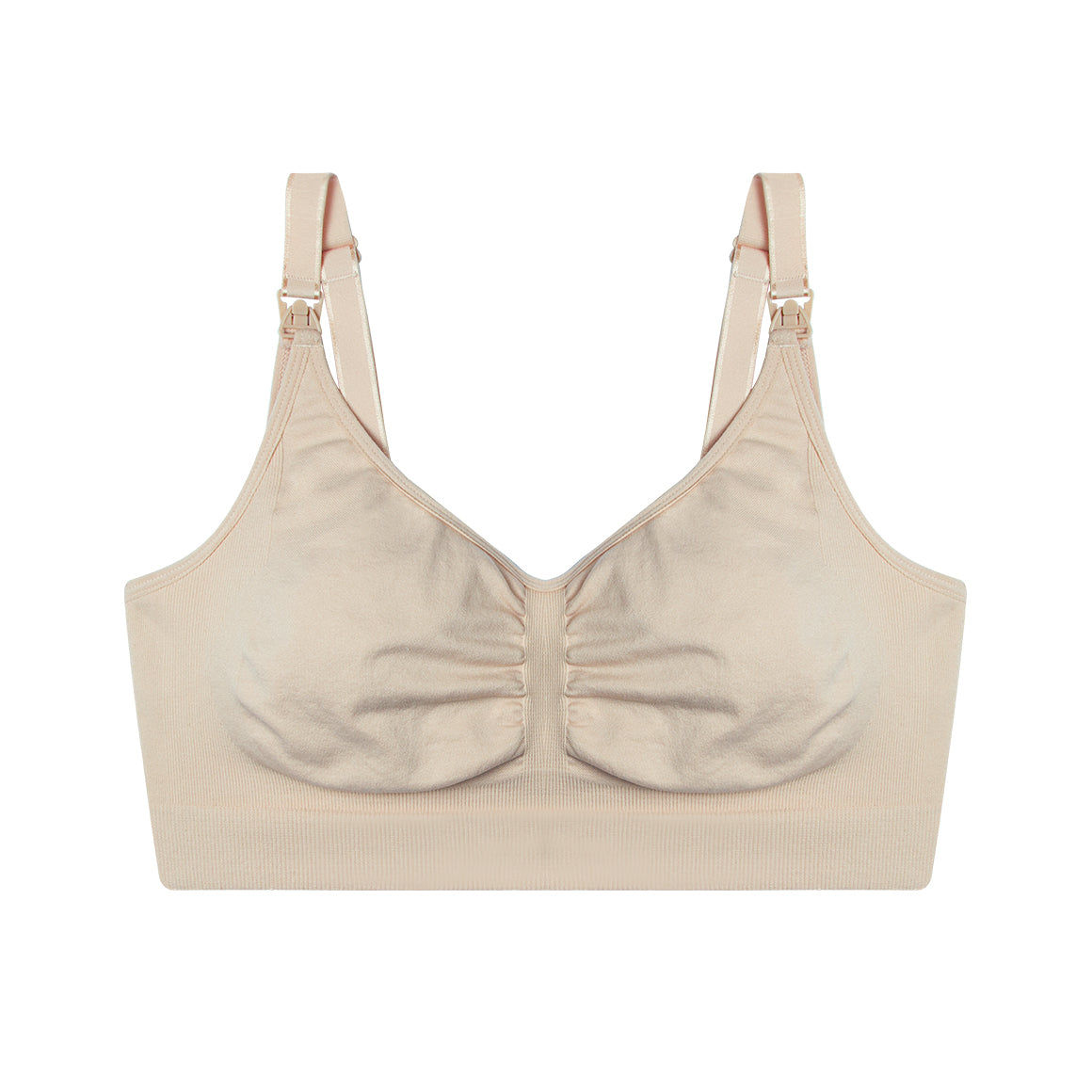 Brasier maternal sin costuras laterales, sin aro, ni copas prehormadas. banda ancha y tirantes regulables. broche de tres ganchos y cuatro niveles de ajuste. elaborado con doble tela de microfibra. con broche en la parte superior de cada copa, que permite dejar el busto libre para la lactancia sin bajar el tirante.